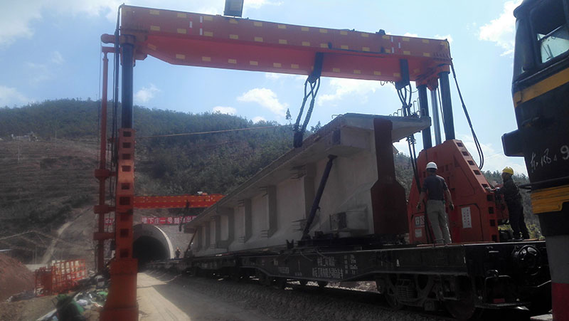 雙線倒裝龍門(mén)架是一種跨雙線的梁片或軌排的倒裝龍門(mén)架,它可在平車(chē)和炮車(chē)之間通過(guò)橫移方式實(shí)現(xiàn)梁片或軌排的吊裝。既適用于雙線倒裝,也適用于單線倒裝。支起時(shí)內(nèi)部空間可通過(guò)機(jī)車(chē)。運(yùn)輸時(shí)滿足限界要求。倒裝龍門(mén)架主要由增高節(jié)、底架總成、柴油發(fā)電機(jī)、液壓系統(tǒng)、電控系統(tǒng)、導(dǎo)向柱組成、升降機(jī)構(gòu)、護(hù)架組成、起重梁、橫移機(jī)構(gòu)、吊繩裝置、油缸總成等部分組成。